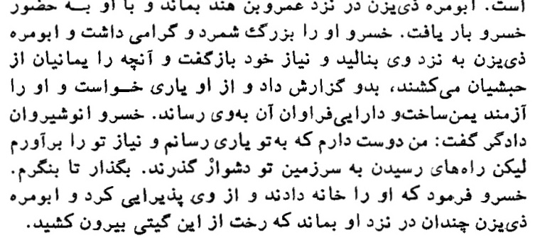 مشاهده می فرمایید که کاملا منطبق بر ترجمه ابوالقاسم حالت است و ذویزن سعی داشته انوشیروان را به طمع یمن و اموالش وارد معرکه کند اما انوشیروان در پاسخ گفته است : که من دوست دارم تو را به حاجتت برسانم ولی راه های رسیدن به یمن صعب است و در پایان گفته است : و سانظر معنای ان مشخص است یعنی بررسی می کنم و پاسخ می دهم .